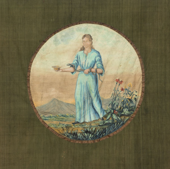 In addition to the departments of Philosophy, Theology and Law, the Department of Medicine is one of Erlangen University's four founding departments. On this banner created for the 100th anniversary of the founding of the university in 1843, it is symbolised by the ancient Greek goddess of healing, Hygieia. Her symbol, an Aesculapian snake drinking from a bowl, can still be found today as part of the emblem used by German pharmacies.