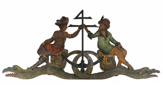 With this colossal carving, whose anchor motif refers to the maritime trade, shopkeeper Schmidt probably intended to draw attention to the origins of his wares in distant lands. It is notable that here, a dark-skinned man and a European-looking man sit opposite each other in harmony. The indigenous person is not yet characterised here as a member of an inferior species, which become customary later, but as a 'noble savage' with feathered headdress and gold cuffs. The reality of slave labour, on which the extraction of 'colonial goods' was based, is completely ignored in this depiction.