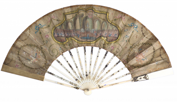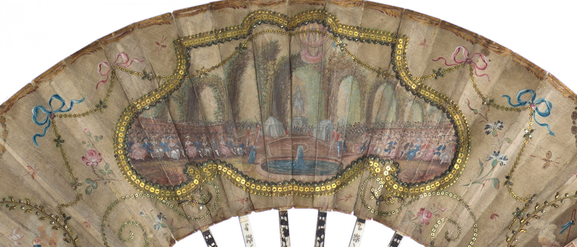 Auf diesem 1789 gefertigten Fächer aus der Erlanger Posamentierwerkstatt Falkeisen ist der erste Aufstieg eines Ballons in Erlangen am 30. September 1784 festgehalten. Es handelte sich zwar nur um einen kleinen Modellballon ohne Passagiere, wie ihn damals viele Schausteller einem staunenden Publikum präsentierten. Dennoch war das Spektakel, das im Schlossgarten stattfand, sicher eine Sensation.