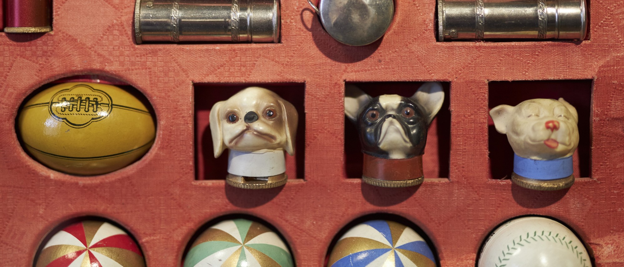 Charlie Chaplin, ein Saxophon und die Weltkugel gemeinsam in einem Kasten? Was zunächst irritiert, stellt sich auf den zweiten Blick als Musterkasten der Bleistiftspitzerfabrik KUM heraus. In den ausgesparten Fächern eines mit rotem Stoff bezogenen Holzkastens befinden sich die Spitzermodelle aus der Kollektion des Jahres 1932. Motivisch spiegeln sie den damaligen Zeitgeist wider. Charlie Chaplin war mit seinem Film „Lichter der Großstadt“ in aller Munde, Jazz in aller Ohren und mit dem Globus hatte die Firma KUM 1928 einen Bestseller unter den Modellen für Anspitzern etabliert.