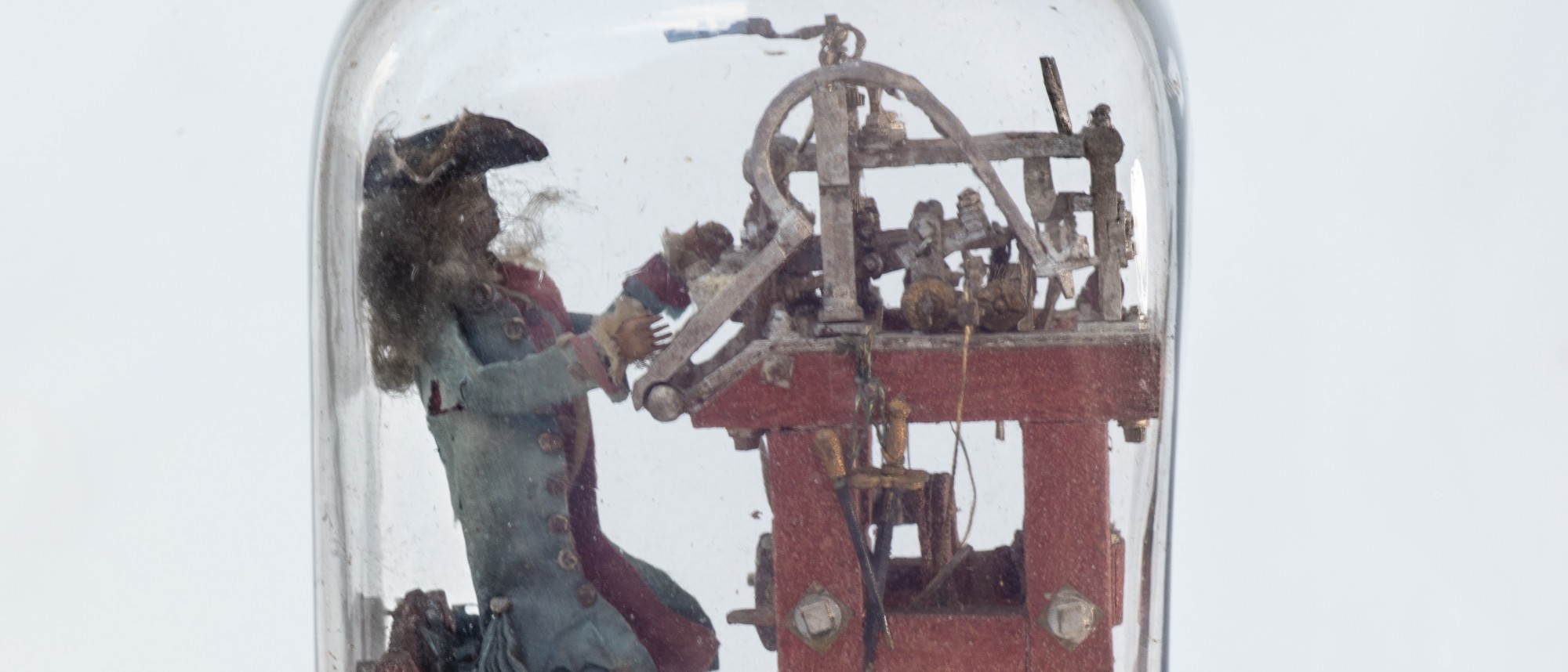 Die Flasche aus dem Jahr 1719 enthält einen detailgetreu nachgebildeten Miniatur-Strumpfwirkerstuhl. Vermutlich stand dieses Stuben- oder Zunftzeichen in der Wirtsstube des Gasthauses, in der die Strumpfwirker zusammenkamen. Um den Stolz auf das eigene Handwerk zu betonen, ist der Strumpfwirker nicht in Arbeitskleidung, sondern in feinem Gewand dargestellt. Das zierliche Modell wurde zum Schutz in einer Glasflasche „eingerichtet“ und wird daher auch als „Eingericht“ bezeichnet.