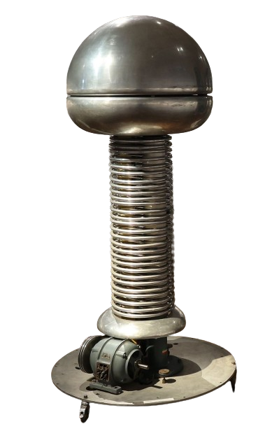 Dieser Bandgenerator erzeugt Hochspannung: Durch den Siemens-Schuckert-Motor am Sockel wird ein auf Walzen gespanntes Gummiband in Bewegung versetzt. Die Reibung des Bandes trennt die elektrische Ladung im Inneren des Generators. Die negative Ladung sammelt sich an der Oberfläche der großen Hohlkugel und kann so groß werden, dass sie sich als Blitz an die Umgebung entlädt. Kleinere Bandgeneratoren werden deshalb auch im Physikunterricht eingesetzt, um die Entstehung von Gewitterblitzen zu demonstrieren.