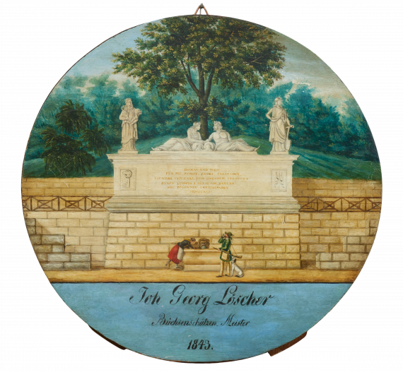 Am 15. Juli 1846 wurde das Kanaldenkmal am Erlanger Burgberg enthüllt, ein kolossales Monument aus „Kelheimer Marmor“. Die Schützenscheibe des Büchsenschützen-Meisters Johann Georg Löscher zeigt das Denkmal schon drei Jahre vor seiner offiziellen Enthüllung.