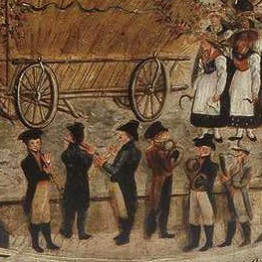 Dem mit Ochsen bespannten Erntewagen folgen Schnitterinnen und Bauern, seitlich hat die Schützenkompanie Aufstellung genommen, eine Kapelle sorgt für musikalische Untermalung. An den Fenstern der umliegenden Häuser haben sich Schaulustige versammelt.