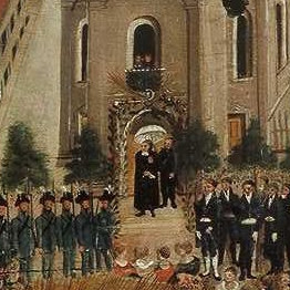 Die detailreich bemalte Schützenscheibe aus dem Jahr 1817 (nach anderen Quellen 1811) zeigt einen Erntedankzug am heutigen Martin-Luther-Platz. Der Gottesdienst ist soeben zu Ende gegangen, Stadtpfarrer Ackermann tritt vor das geschmückte Portal der Dreifaltigkeitskirche und beobachtet gut beschirmt das bunte Treiben.