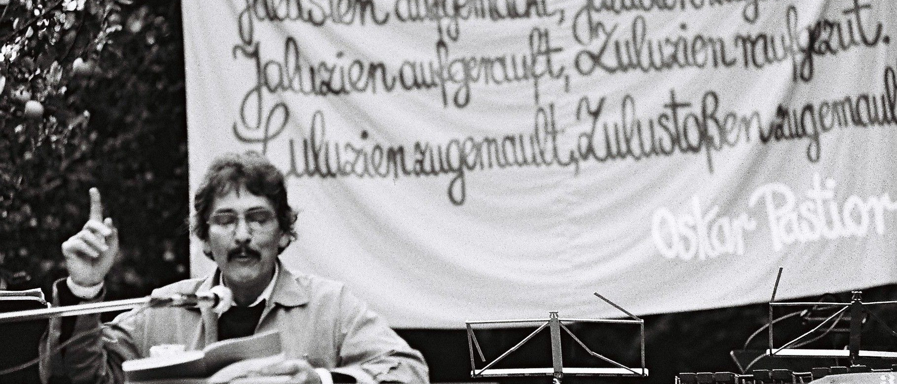 Das Erlanger Poetenfest war ein besonderer Ort für den Lyriker und Übersetzer Oskar Pastior (1927–2006). Seit 1982, als ihn ein Laken mit den Anfangszeilen aus seinem „Jalousiengedicht“ begrüßte, war er mehrfach in Erlangen zu Gast. Hier hatte er auch seinen letzten öffentlichen Auftritt.