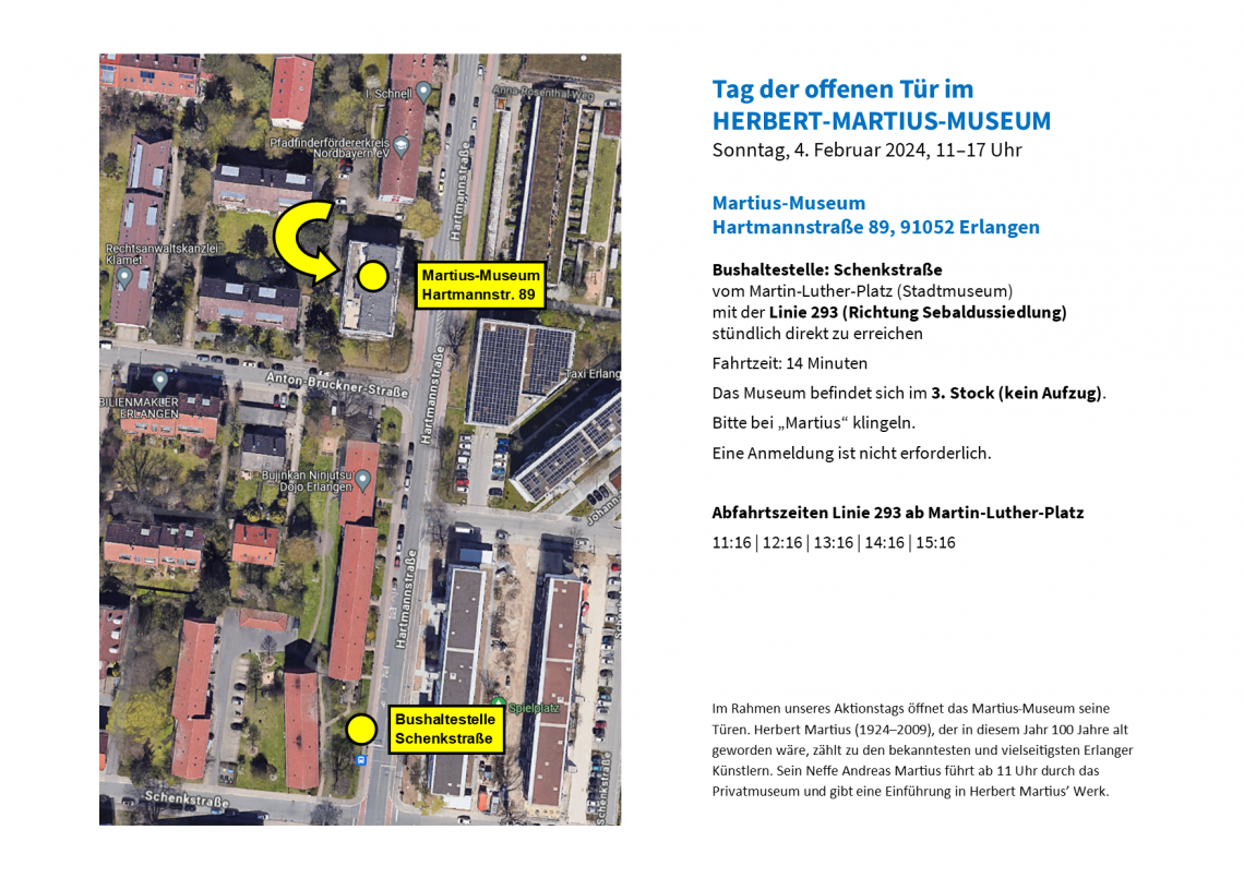 Herbert Martius (1924–2009), der in diesem Jahr 100 Jahre alt geworden wäre, gehört zu den bekanntesten und vielseitigsten Erlanger Künstlern. Sein Neffe Andreas Martius führt ab 11 Uhr durch das Privatmuseum.