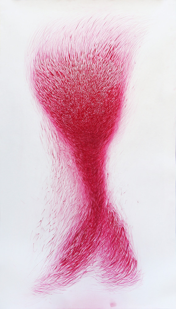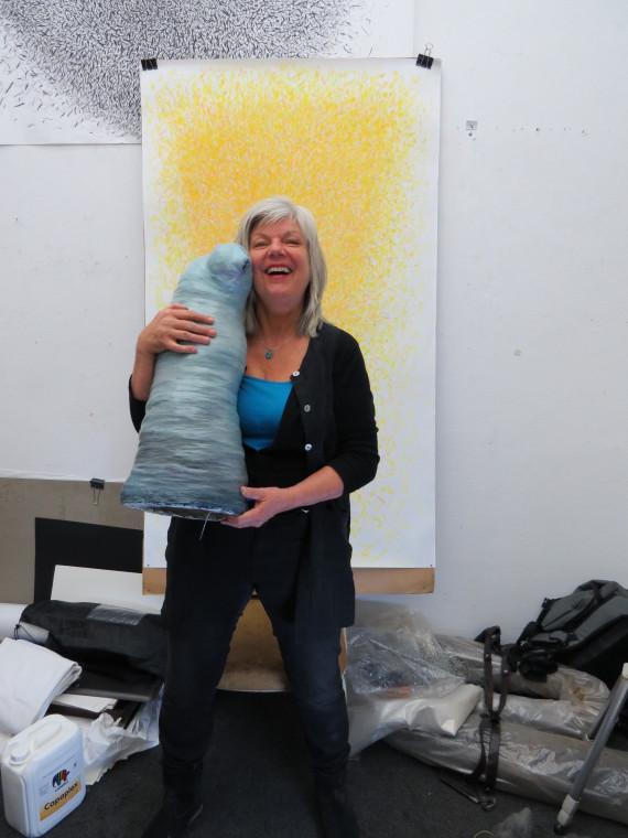 Die seltsam anmutenden Figuren, die sie in den Ausstellungsräumen platziert, nennt sie „Dunkle Seelen“, „Quarks“, „Durchbeißer“ oder „Rüssler“. Aktzeichnungen kombiniert sie mit Lederhandschuhen, das Lurchi-Karussell und den stillgelegten Bandgenerator umgibt sie mit ihren „Vibrationszeichnungen“.